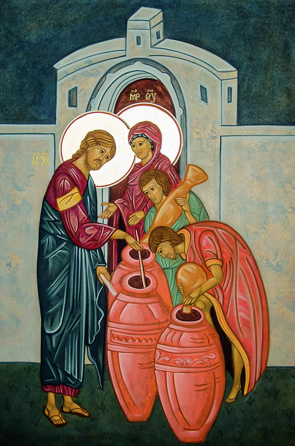 På tredje dagen hölls ett bröllop i Kana i Galileen, och Jesu mor var där. Jesus och hans lärjungar var också bjudna till bröllopet. Vinet tog slut, och Jesu mor sade till honom: ”De har inget vin.” Jesus svarade: ”Låt mig vara, kvinna. Min stund har inte kommit än.” Hans mor sade till tjänarna: ”Gör det han säger åt er.” Där stod sex stora stenkärl för vattnet till judarnas reningsceremonier; vart och ett rymde omkring hundra liter. Jesus sade: ”Fyll kärlen med vatten”, och de fyllde dem till brädden. Sedan sade han: ”Ös upp och bär det till bröllopsvärden”, och det gjorde de. Värden smakade på vattnet, som nu hade blivit vin. Eftersom han inte visste varifrån det kom – men det visste tjänarna som hade öst upp vattnet – ropade han på brudgummen och sade: ”Alla andra bjuder först på det goda vinet och på det sämre när gästerna börjar bli berusade. Men du har sparat det goda vinet ända till nu.” Så gjorde Jesus det första av sina tecken; det var i Kana i Galileen. Han uppenbarade sin härlighet, och hans lärjungar trodde på honom.