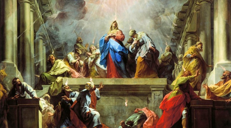 När pingstdagen kom var de alla församlade. Då hördes plötsligt från himlen ett dån som av en stormvind, och det fyllde hela huset där de satt. De såg hur tungor som av eld fördelade sig och stannade på var och en av dem. Alla fylldes av helig ande och började tala andra tungomål, med de ord som Anden ingav dem.I Jerusalem bodde fromma judar från alla länder under himlen. När dånet ljöd samlades hela skaran, och förvirringen blev stor när var och en hörde just sitt språk talas. Utom sig av förvåning sade de: »Men är de inte galileer allesammans, dessa som talar? Hur kan då var och en av oss höra sitt eget modersmål talas? Vi är parther, meder, elamiter, vi kommer från Mesopotamien, Judeen och Kappadokien, från Pontos och Asien, från Frygien och Pamfylien, från Egypten och trakten kring Kyrene i Libyen, vi har kommit hit från Rom, både judar och proselyter, vi är kretensare och araber – ändå hör vi dem tala på vårt eget språk om Guds stora gärningar.« I sin häpnad visste ingen vad han skulle tro, och de frågade varandra: »Vad betyder detta?« Men andra gjorde sig lustiga och sade: »De har druckit sig fulla på halvjäst vin.«