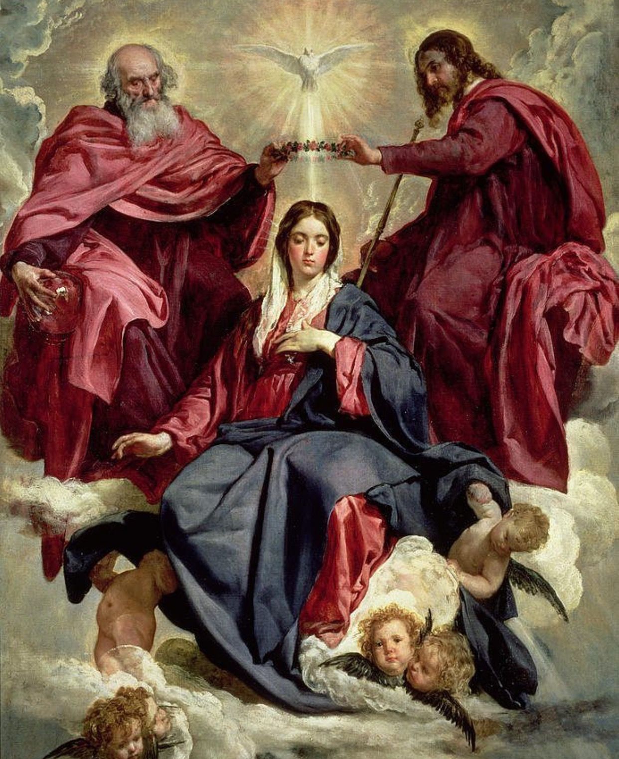 Och ett stort tecken syntes på himlen, en kvinna klädd i solen och med månen under sina fötter och en krans av tolv stjärnor på sitt huvud. Hon är havande, och hon ropar i barnsnöd och födslovånda.