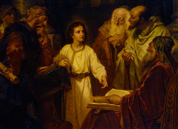 Hans föräldrar brukade varje år bege sig till Jerusalem vid påskhögtiden. Också när Jesus var tolv år gammal gick de dit upp som seden var vid högtiden. Då festen var över och de skulle hem igen, stannade pojken Jesus kvar i Jerusalem utan att föräldrarna visste om det. De gick en dagsled i tron att han var med i ressällskapet och frågade sedan efter honom bland släktingar och bekanta. När de inte hittade honom vände de tillbaka till Jerusalem och letade efter honom där. Efter tre dagar fann de honom i templet, där han satt mitt bland lärarna och lyssnade och ställde frågor. Alla som hörde honom häpnade över hans förstånd och de svar han gav. Föräldrarna blev bestörta när de såg honom, och hans mor sade till honom: ”Barn, hur kunde du göra så mot oss? Din far och jag har letat efter dig och varit mycket oroliga.” Han svarade: ”Varför skulle ni leta efter mig? Visste ni inte att jag måste vara hos min fader?” Men de förstod inte vad han menade med sina ord. Sedan följde han med dem ner till Nasaret, och han lydde dem i allt. Hans mor bevarade allt detta i sitt hjärta. Och Jesus blev äldre och visare och vann Guds och människors välbehag.